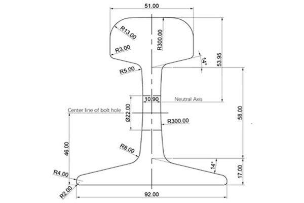 In order to make the rail better withstand the force from all directions, the necessary strength conditions are guaranteed. In order to make the rail better withstand the forces from all directions and ensure the necessary strength conditions, the 136lb rail is designed as a heavy duty rail with sufficient height, the rail height is 185.74mm. The head and bottom of the 136-pound rail are designed with sufficient area and height, and the waist thickness reaches 17.46mm.